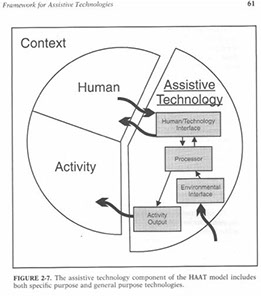 3. Human Activity Assistive Technology model (HAAT): proposes a framework for understanding the place of assistive technologies in the place of the lives of those with disabilities. This model takes into consideration the individual’s current skill level, the activity (self-care, work/school, play/leisure) that the individual is expected to perform, and the context (social, cultural, and physical) in which the activity takes place (Cook & Polgar, 2008)